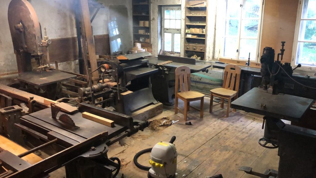 Neben dem Maschinenraum befindet sich der Schleifmaschinenraum mit einem Band- und Tellerschleifer. Diese beiden Maschinen werden ebenso per Transmission angetrieben.